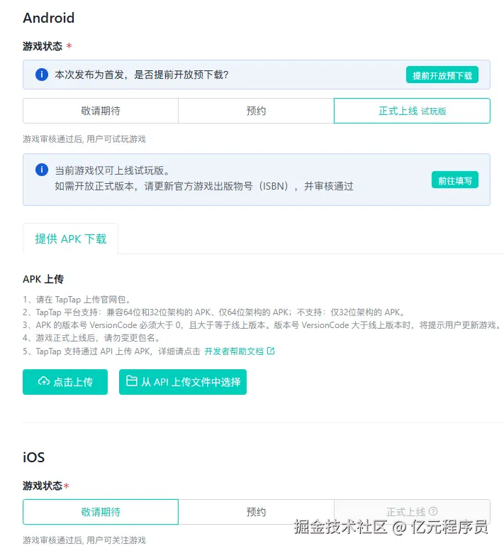 游戏下载和获取: 需要填写游戏的状态(正式上线试玩版,如果要正式上线需要版号)和上传