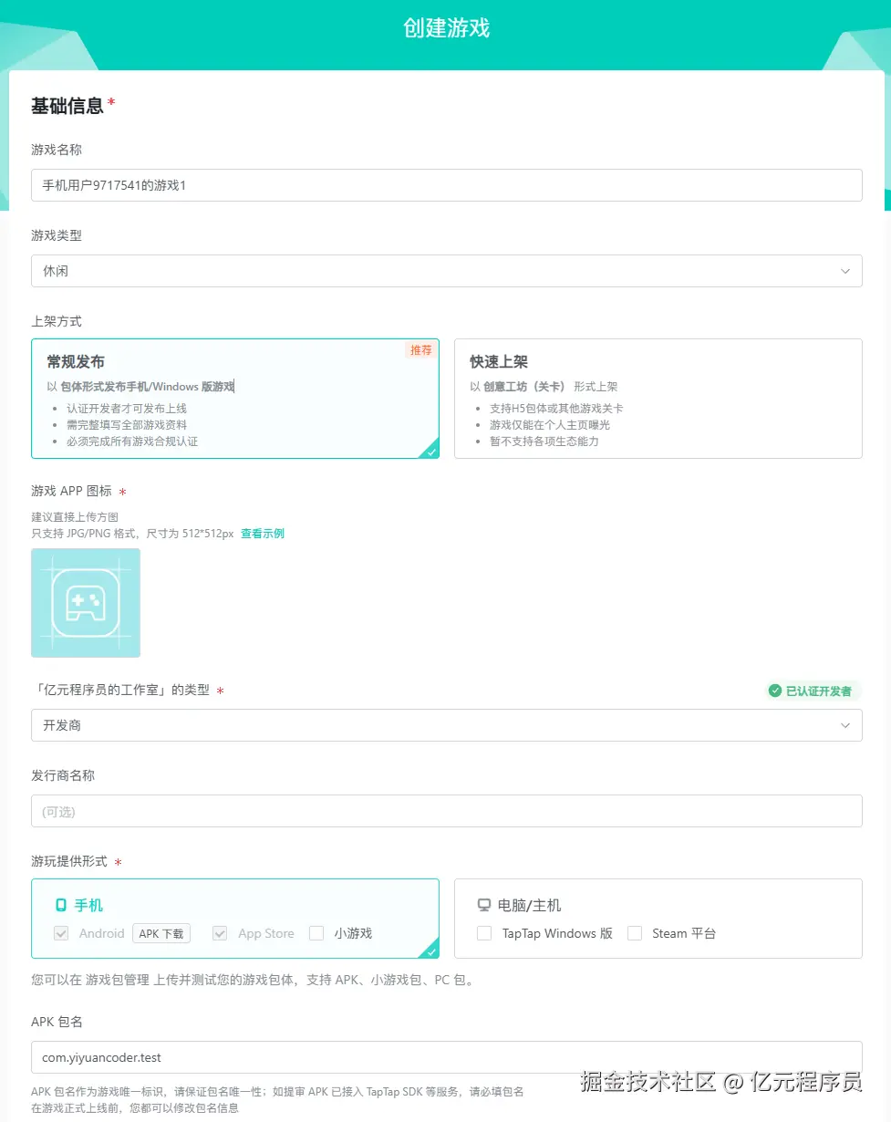 512*512px。 - 开发者类型:开发商/发行商/两者,我们选开发商。