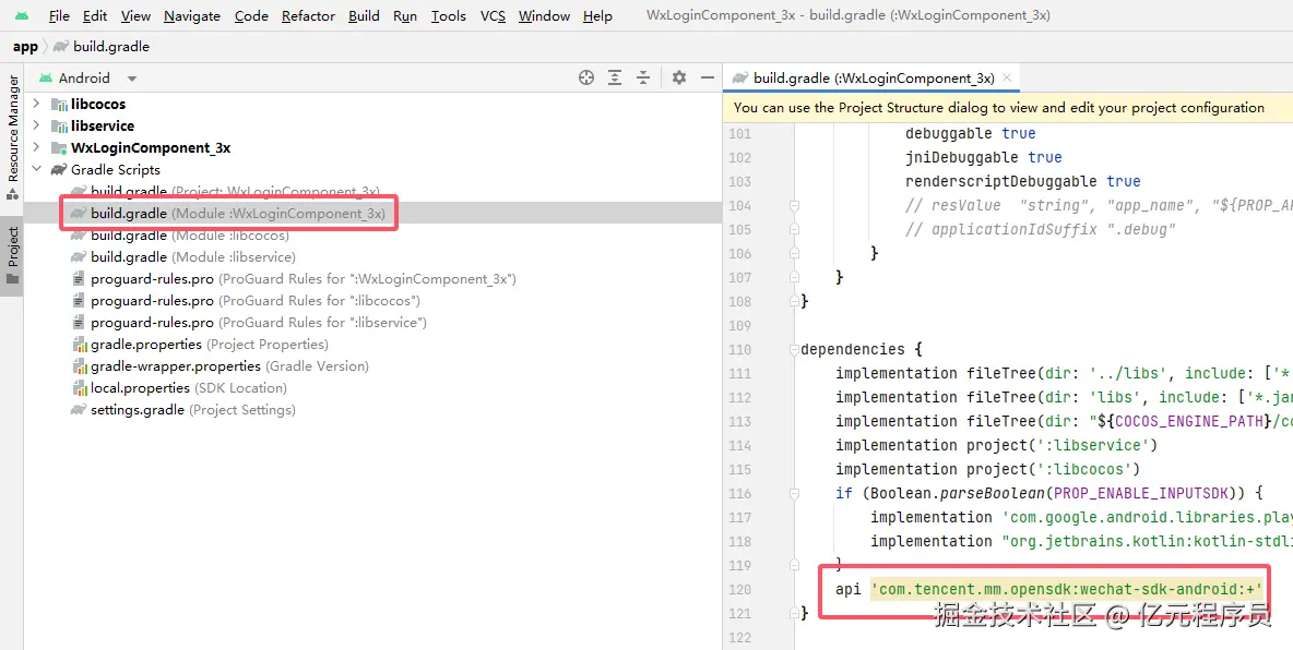 导出原生工程后在模块的build.gradle中引入微信sdkapi 'com.tencent.mm.opensdk:wechat-sdk-android:+'