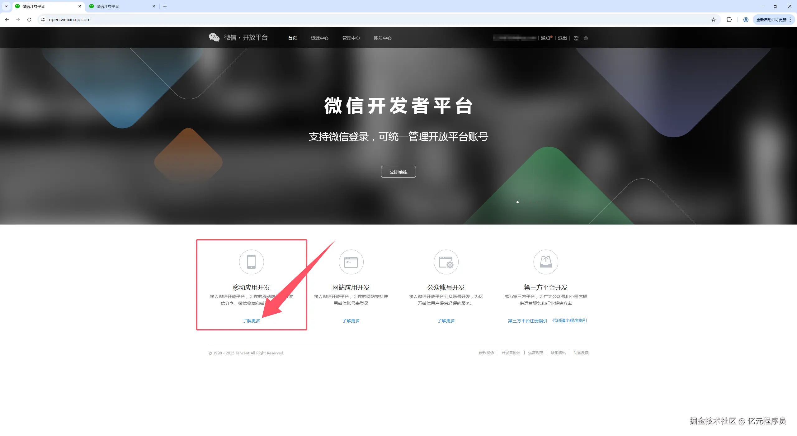 打开官网https://open.weixin.qq.com/,登录后点击移动应用开发下方的了解更多。