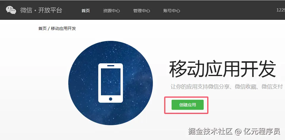 进入到移动应用开发界面后,点击创建应用按钮。