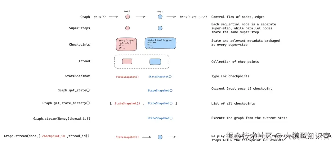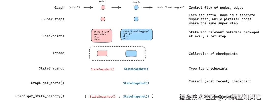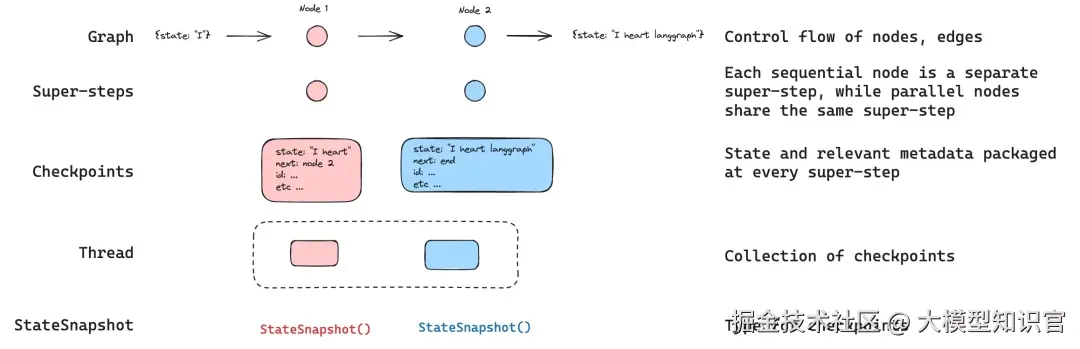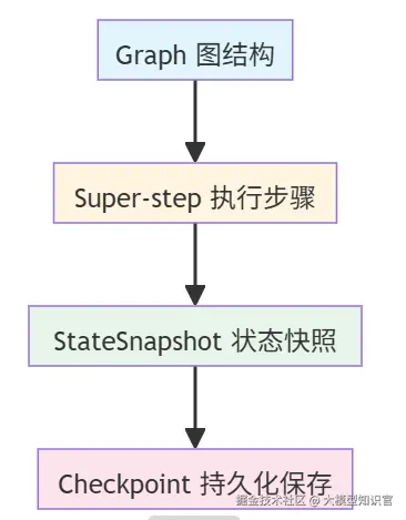 图定义了执行流程,super-step 是执行单位,StateSnapshot 记录状态,checkpoint 将状态持久化保存。