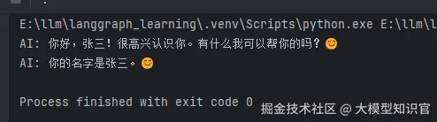 运行这段代码,会发现第二次调用时,AI 能够准确回答"你的名字是张三"。这就是持久化机制在起作用:第二次调用时,checkpointer 自动恢复了第一次对话的历史记录。