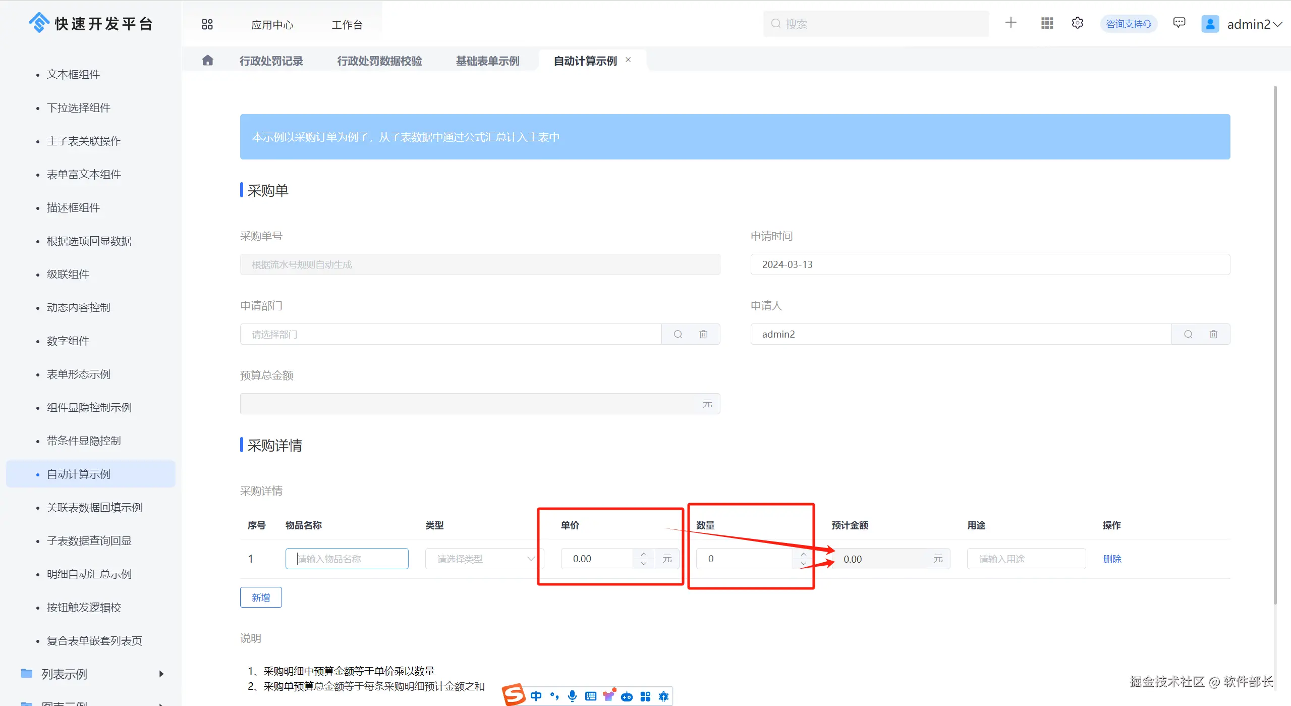 如上图所示,预计金额=单价*数量,那么这里 预算金额的结果就默认设置为一个函数取值,这个取值的方式通过函数公式进行加工获取,在JVS中会在很多地方用到函数公式,当公式不满足时需要我们自己扩展,本文介绍如何自行针对业务进行扩展函数公式。
