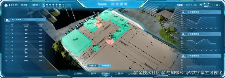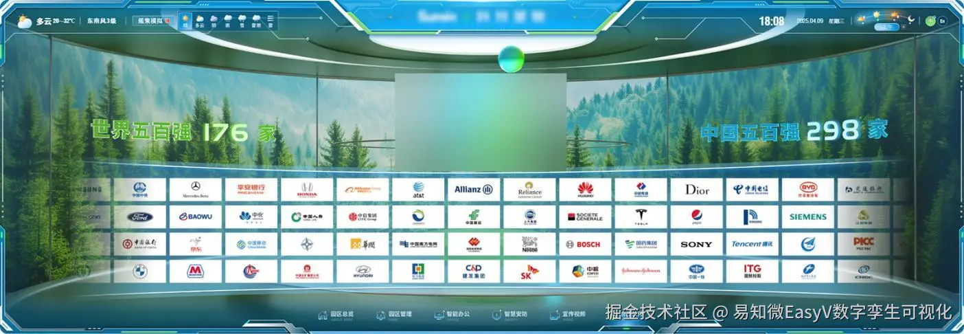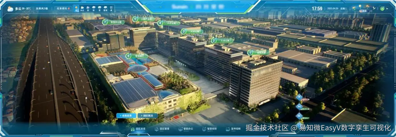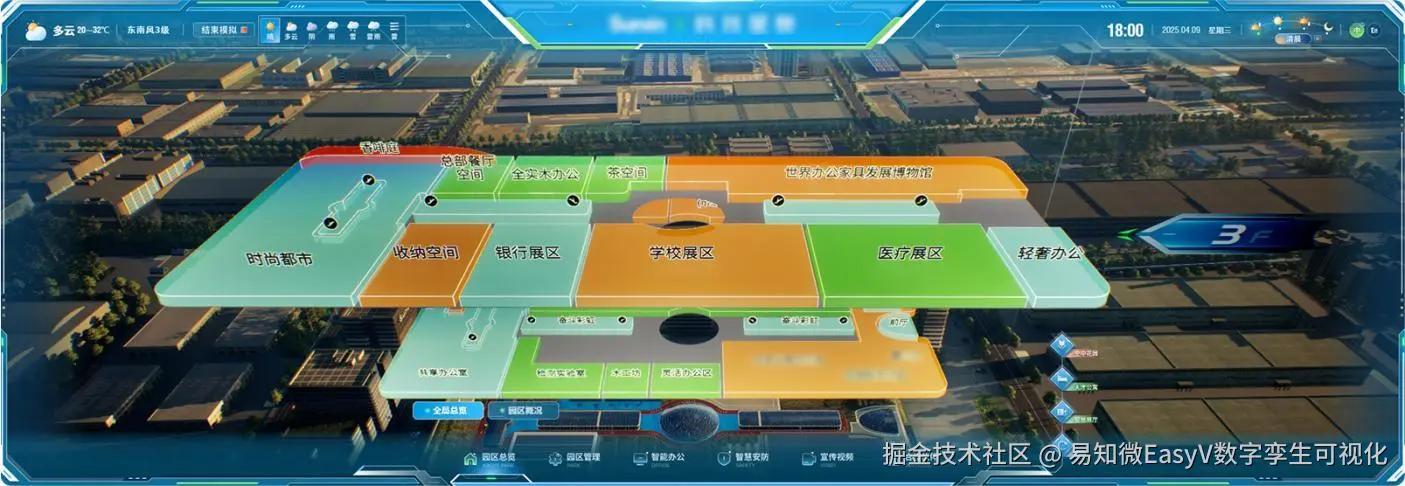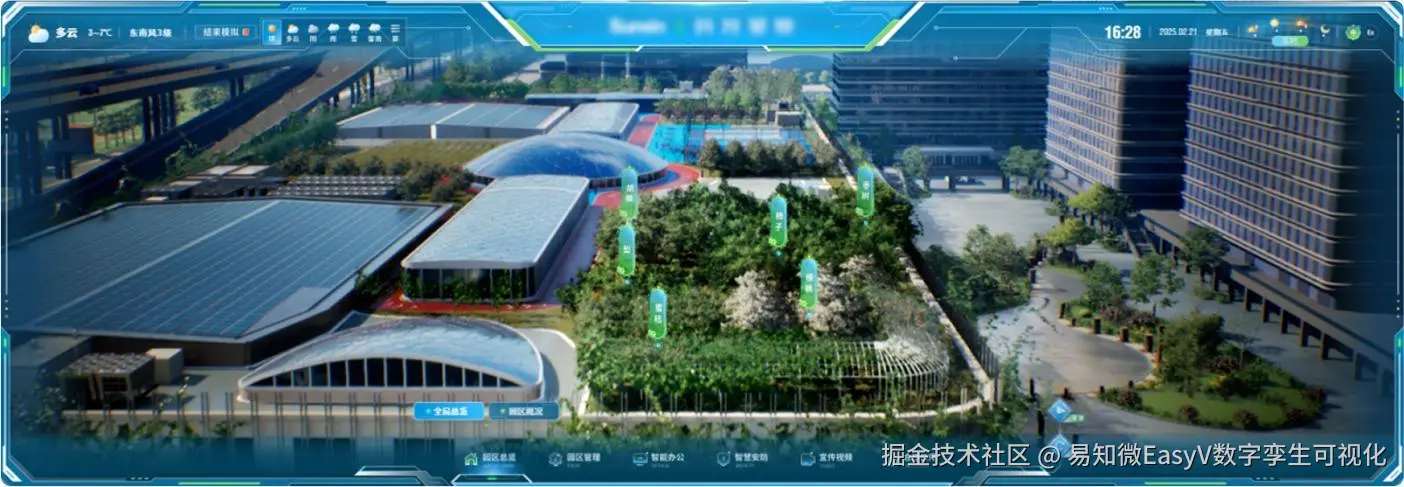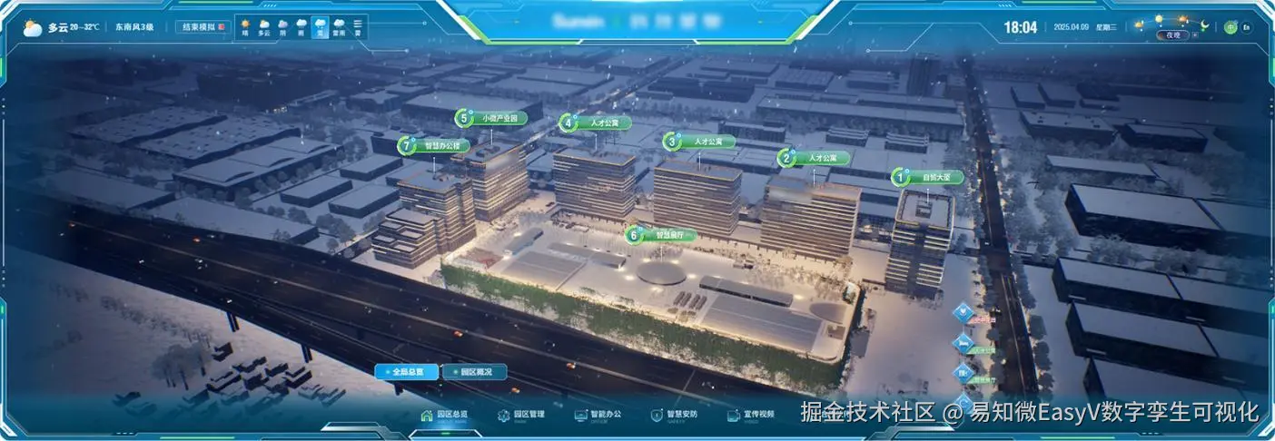 该企业园区数字孪生系统以数字孪生技术为核心,深度融合物联网实时数据与三维可 视化能力,打造了一套覆盖园区全场景的智慧化解决方案。该项目基于倾斜摄影底座数据, 参考建筑设计图纸、图像资料等内容,使用 Blender、Maya 等软件对园区楼宇场景进行 L3-L4 级别建模贴图,整合园区运行、能耗设备、建筑设施、地理信息等多源动态数据, 依托 UE 渲染引擎高精度还原企业三维园区。并与 EasyV 相结合实现了三维场景与实时数据的精准映射,构建“园区总览-园区管理-智能办公-智慧安防-宣传视频-合作伙伴”六大 主题应用场景。