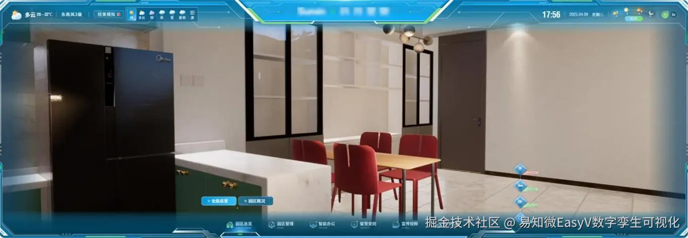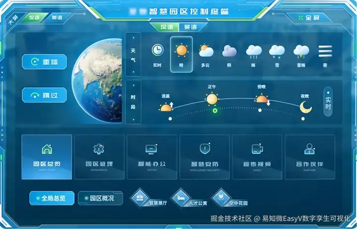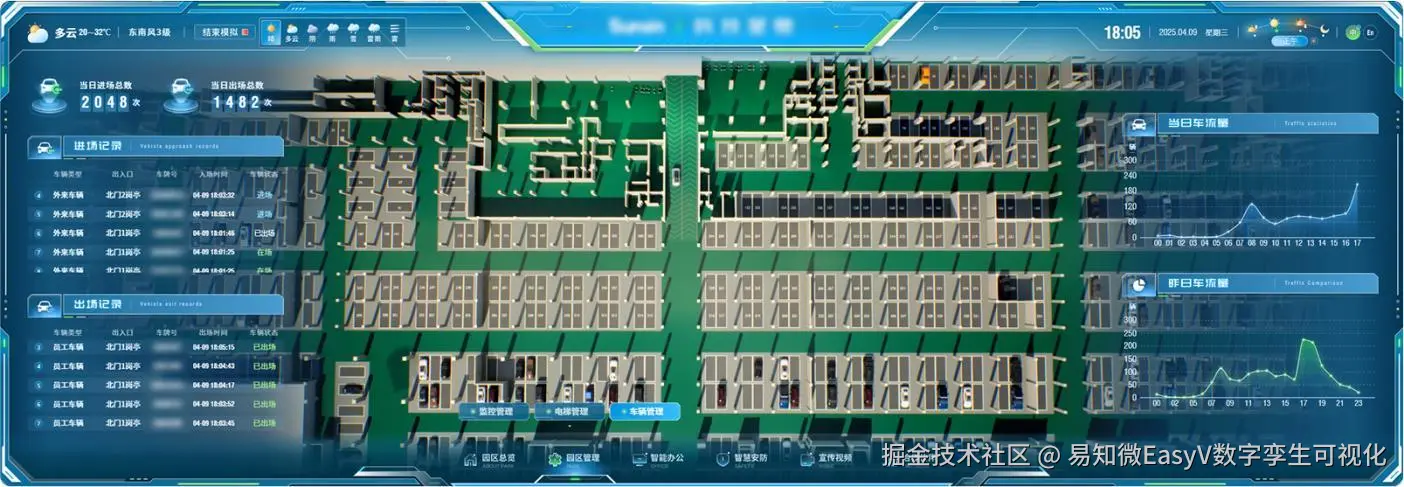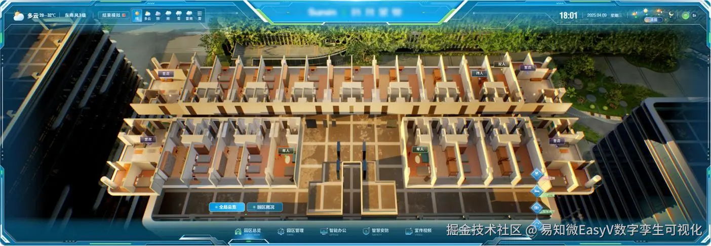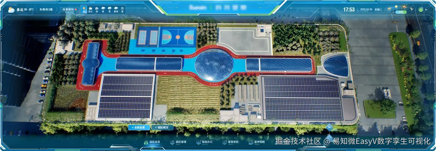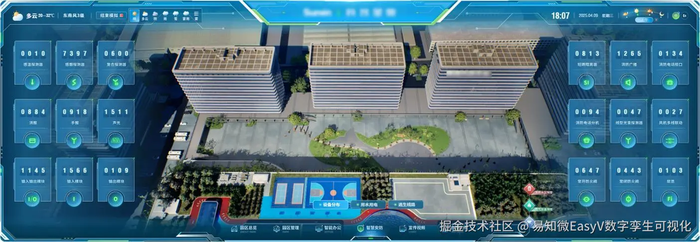 在园区总览模块,可以查看该企业园区的整体概况,并支持通过天气与时段动态切换 三维全景漫游及实时数据看板,直观地模拟展示不同场景下园区的运营全貌。