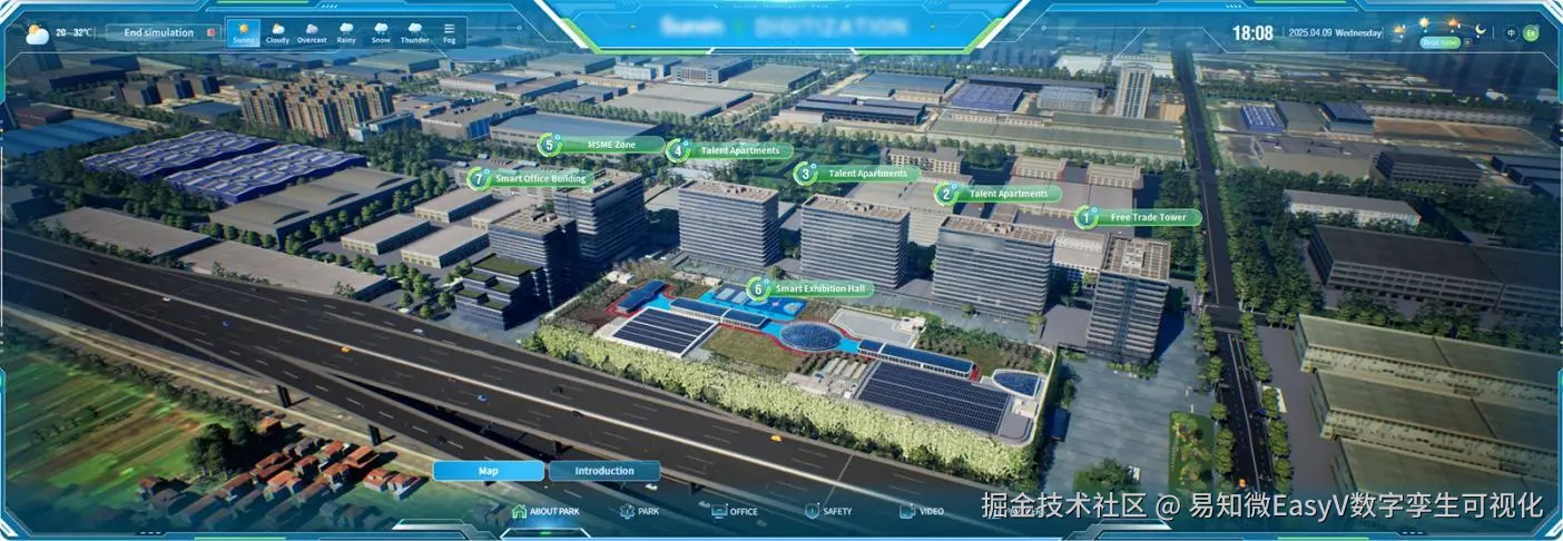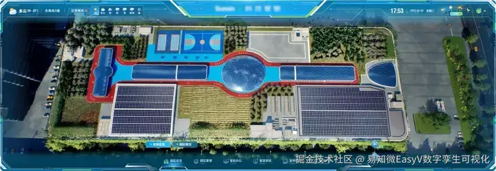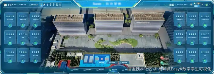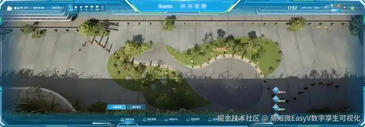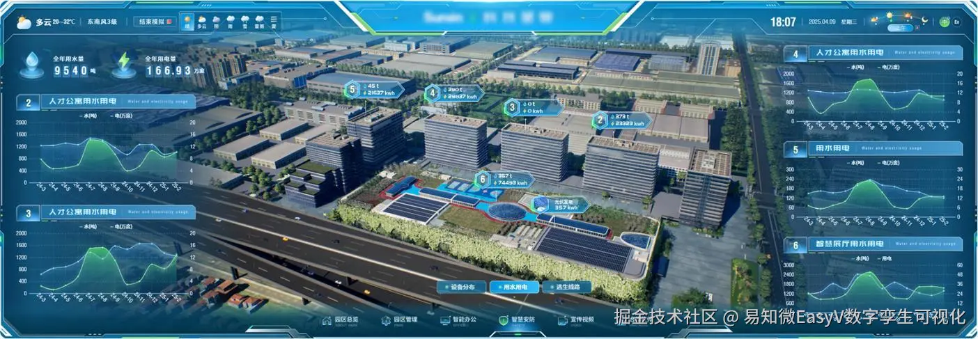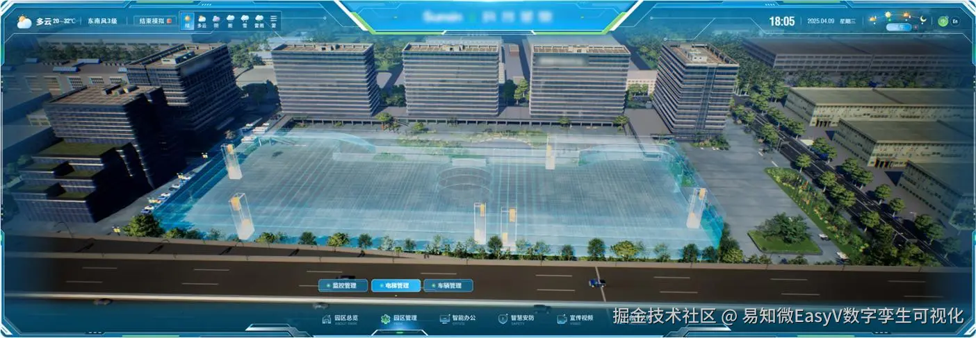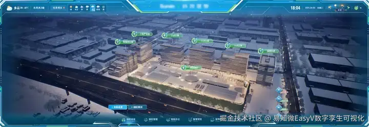 为了更生动、直观地展现该企业在智慧化、数字化管理方面的优势,该企业引入先进的数字孪生技术,重构大屏展示内容。采用游戏引擎进行渲染加载,使得场景更加生动逼真,在数字孪生世界还原科技产业园区。(以下内容均来源于[《数字孪生与智能算法白皮书2025》](易知微 - 数字孪生仿真渲染引擎与可视化应用)