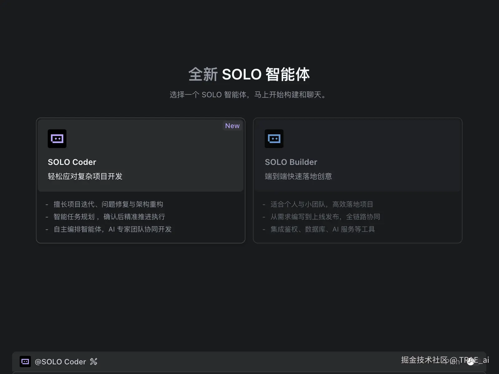 TRAE SOLO 内置了两个核心智能体:SOLO Coder和 SOLO Builder,它们分别适用于不同的开发场景,明确场景后选择合适的智能体,能显著提升推进效率与结果质量。