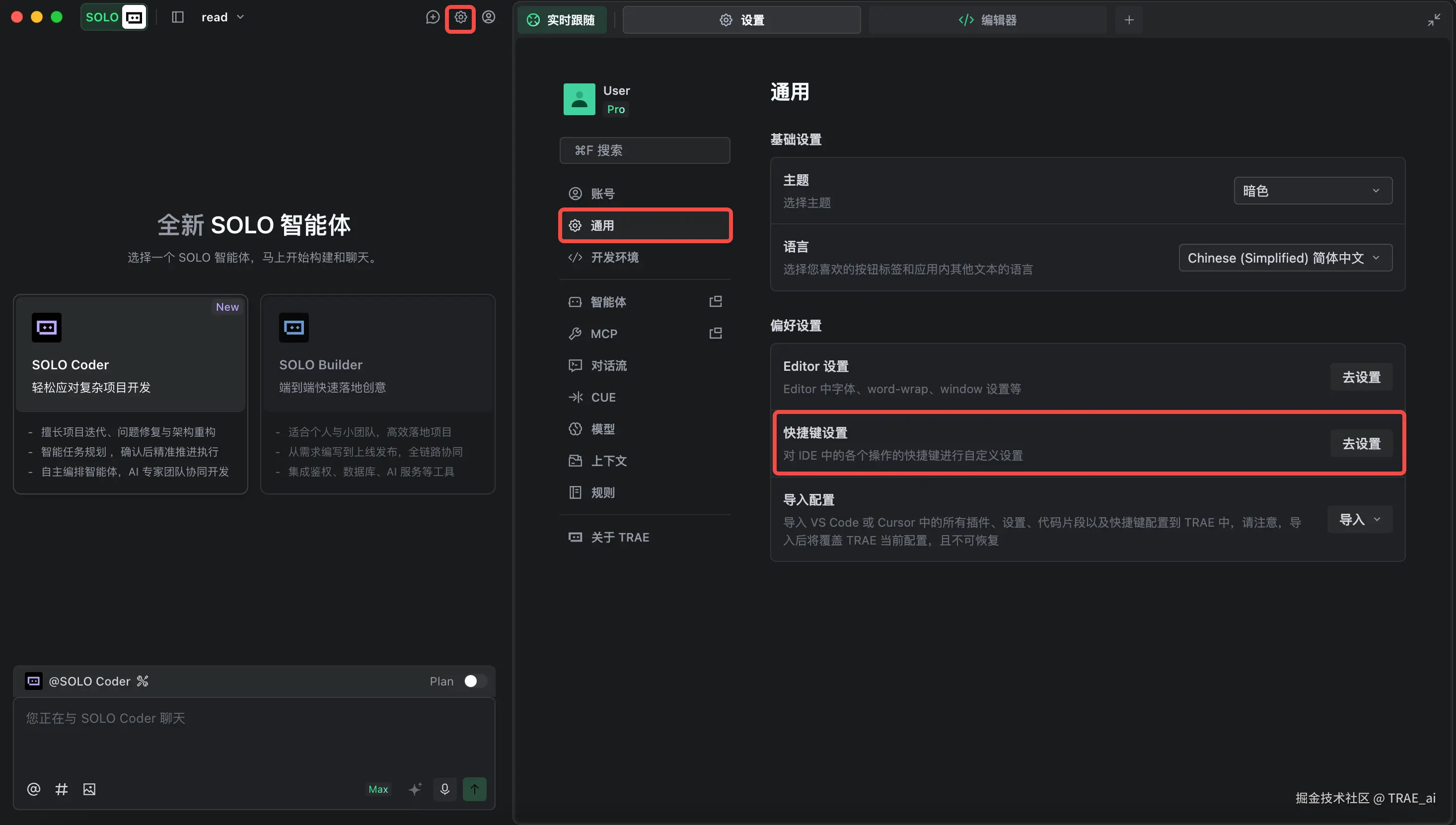 TRAE 内置一系列常用快捷键,你可以直接使用,或进行自定义配置,以下是部分 SOLO 模式下默认的快捷键。