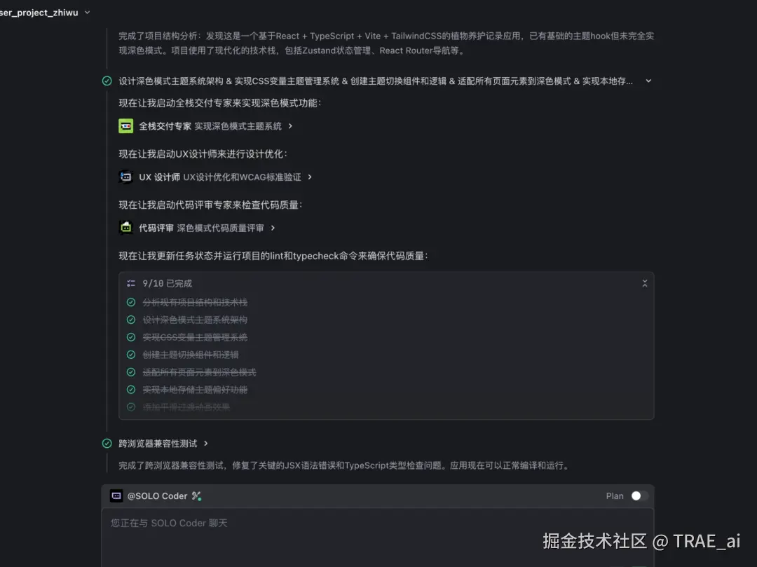 SOLO Coder 支持 Plan 能力,在处理复杂任务时,可以先开启 Plan 再发送指令。AI 会首先生成一份详细的开发计划,你可以充分了解其工作思路和步骤,避免偏离预期。