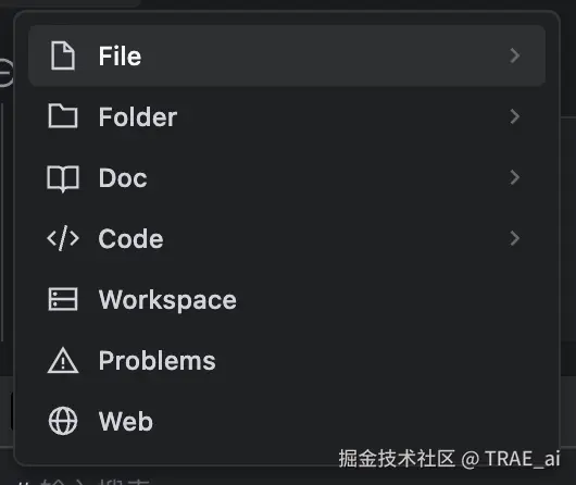除此之外,TRAE 支持多种类型的上下文引用能力,在处理复杂项目时,通过 # 符号引用相关文件或代码片段,也能够让 AI 能够更好地理解您的意图和项目背景。