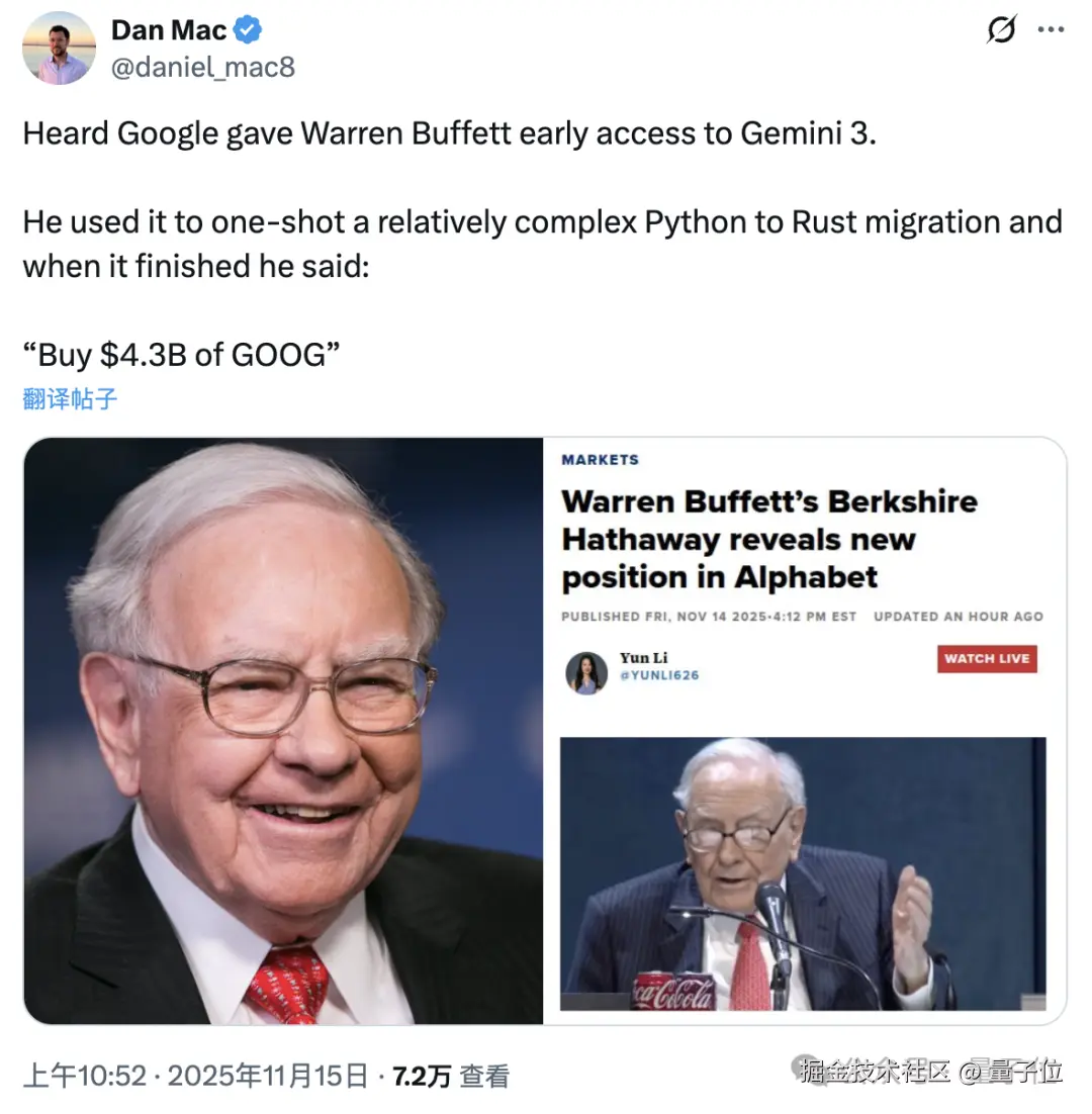 谷歌 Gemini 3 发布在即,对市场观望已久的股神巴菲特出手了,直接抛出 43 亿美元(约 305 亿人民币)加仓 Alphabet。