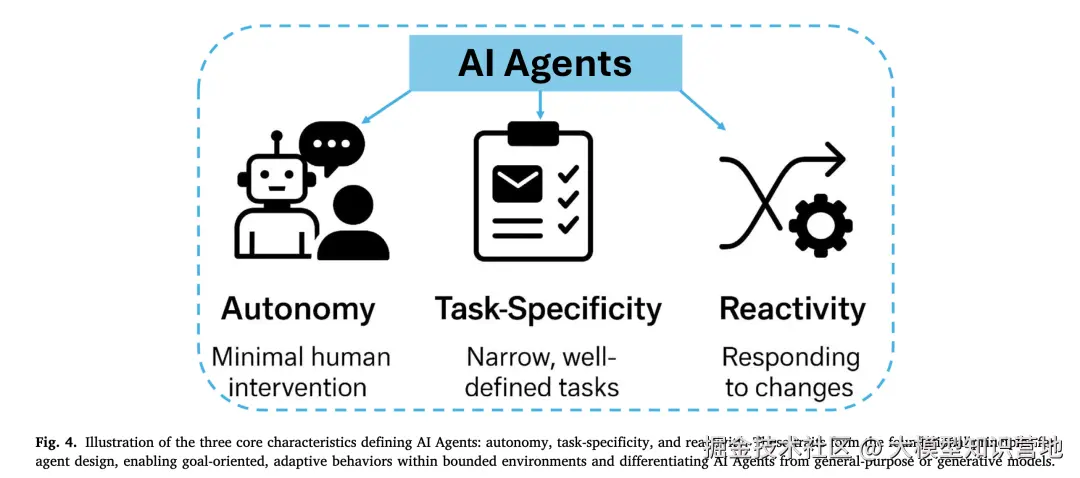 - AI Agent:被定义为由 LLM 驱动、用于 特定任务自动化 的模块化系统。它们通过工具集成(Function Calling)、提示工程(Prompt Engineering)和增强的推理能力(如 ReAct)来执行明确定义的任务,定位为 任务执行者。