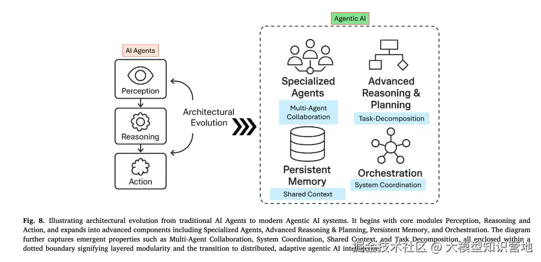 图5: 从 AI Agent 到 Agentic AI 的架构演进示意图,展示了从核心模块到协作能力的扩展。