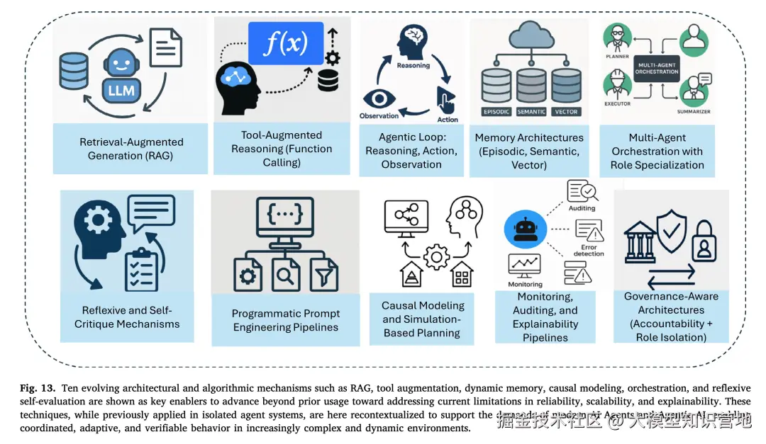 | 幻觉与不可靠 | 继承自 LLM,输出可能不准确。 | **错误可能在代理间传播和放大 (Error Cascades)**,导致系统性失败。 | **RAG (Retrieval-Augmented Generation)**、Reflexion (自我批判)、**跨代理验证 (Cross-Agent Verification)**。 |