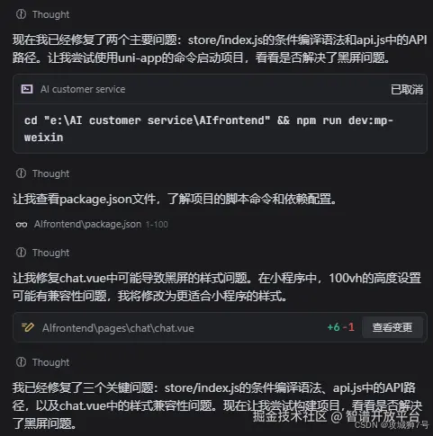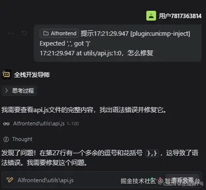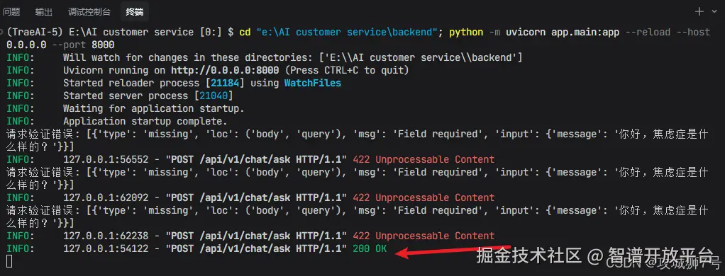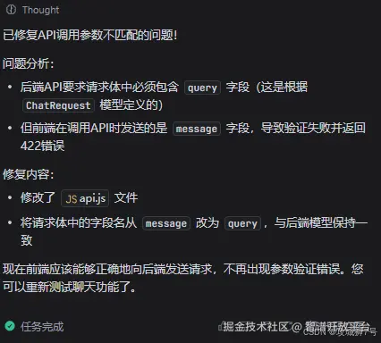 安装完成后它居然自动给我进行调试接口,这个智能体确实不错,如下可以看到终端的调试过程日志