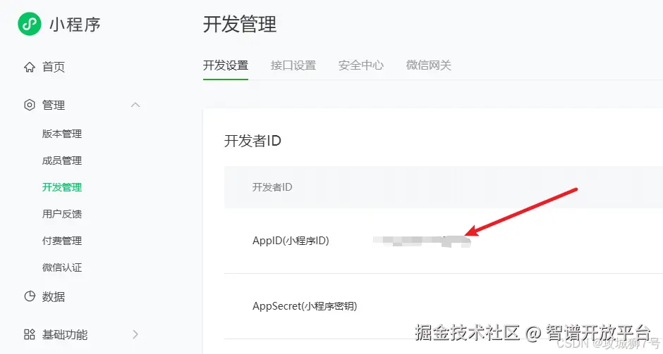 至于如何获取这个AppID,自己注册小程序后,进入后台如下位置就能获取: