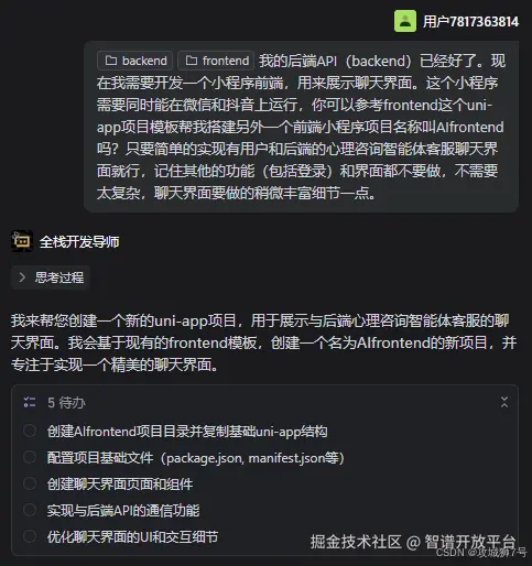 我:“我的后端API(backend)已经好了。现在我需要开发一个小程序前端,用来展示聊天界面。这个小程序需要同时能在微信和抖音上运行,你可以参考frontend这个uni-app项目模板帮我搭建另外一个前端小程序项目名称叫AIfrontend吗?只要简单的实现有用户和后端的心理咨询智能体客服聊天界面就行,记住其他的功能(包括登录)和界面都不要做,不需要太复杂,聊天界面要做的稍微丰富细节一点。”