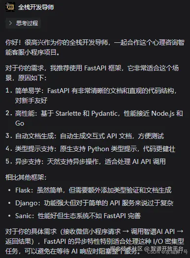 我:“你好,我是一个编程新手。我想用Python3.9做一个后端API服务,它需要接收微信小程序前端发来的用户问题,然后调用智谱AI智能体和知识库的API来获取答案。这个服务要尽可能简单、高效。我该用什么框架?注意先回答问题别创建项目。”