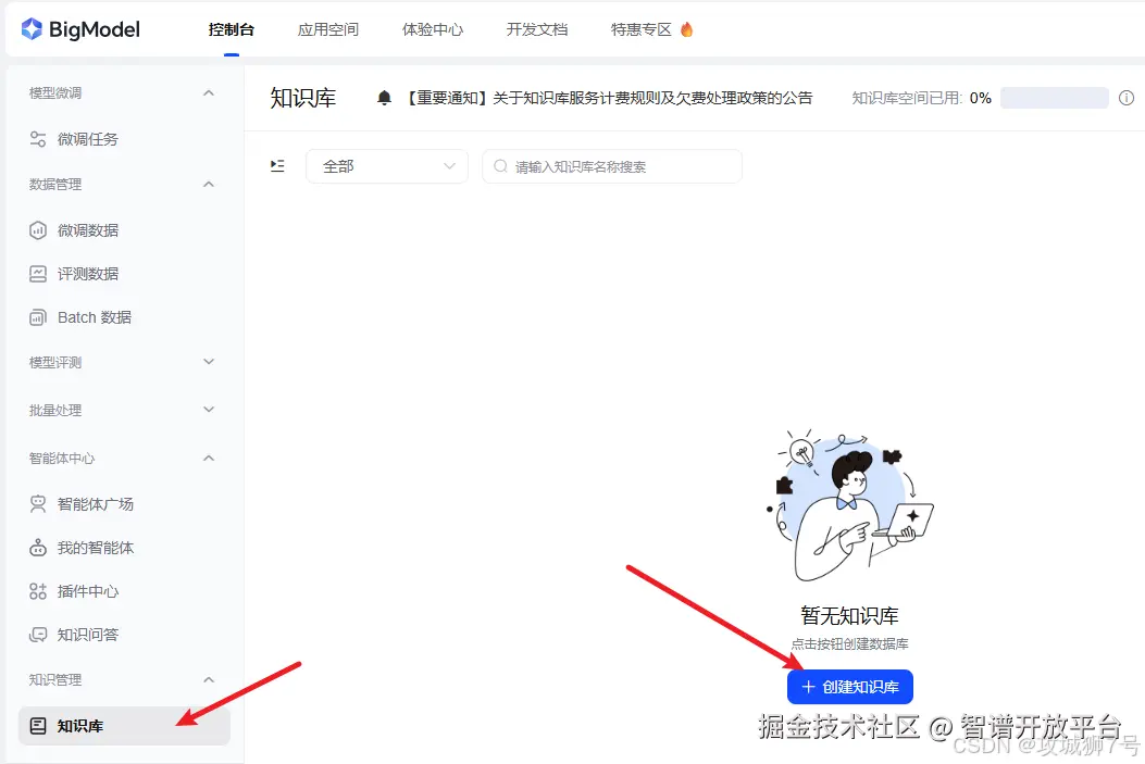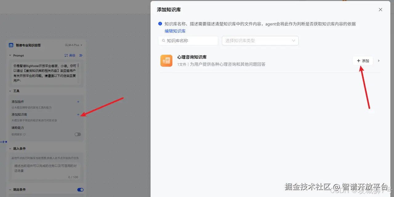 智能客服不能天马行空地乱答,它必须依据心理咨询公司的资料来回答。这里用到智谱AI开放平台的知识库和智能体功能。