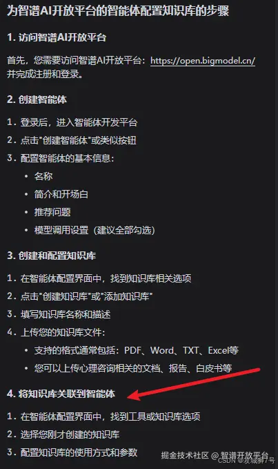 后面经过追问,原来我的全栈开发大师居然从知识库md文件直接获取了答案进行回复,由此我要及时纠正,并且问他:如何为智谱AI开放平台的智能体配置知识库?