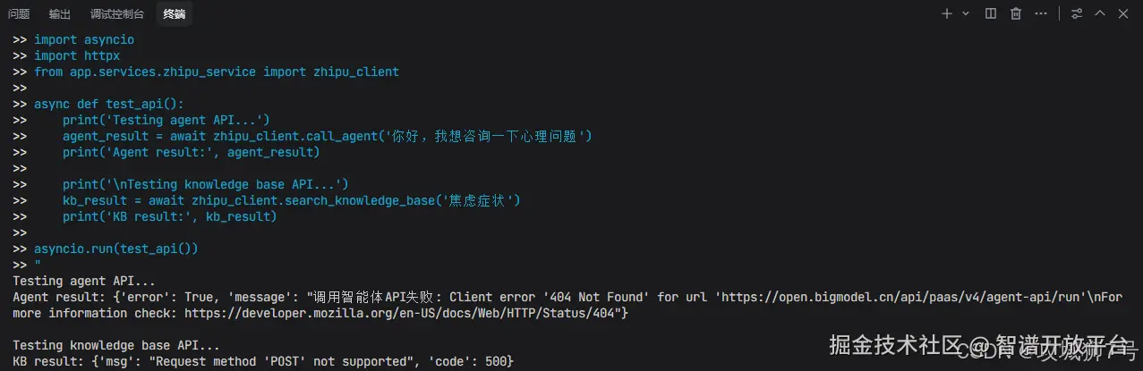 经过智能体的提示,原来我的智能体id,知识库id,api key都还没正确设置在.env文件,在智谱官网获取即可