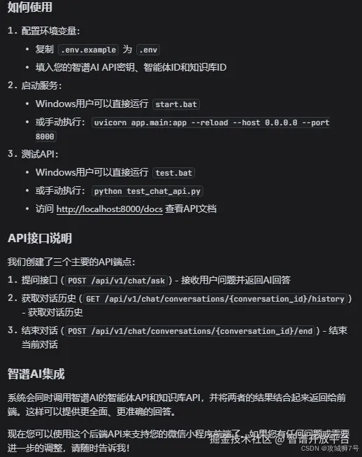 总之我几乎没怎么修改,我只是把API Key和智能体ID填了进去env文件。GLM-4.6 甚至贴心地加入了跨域配置、数据校验、异常处理,并写清了注释,告诉我每一块代码是干什么的,以及如何在终端启动服务。 看到服务成功运行的提示时,我感觉自己打开了新世界的大门。后端“大脑”,成了!
