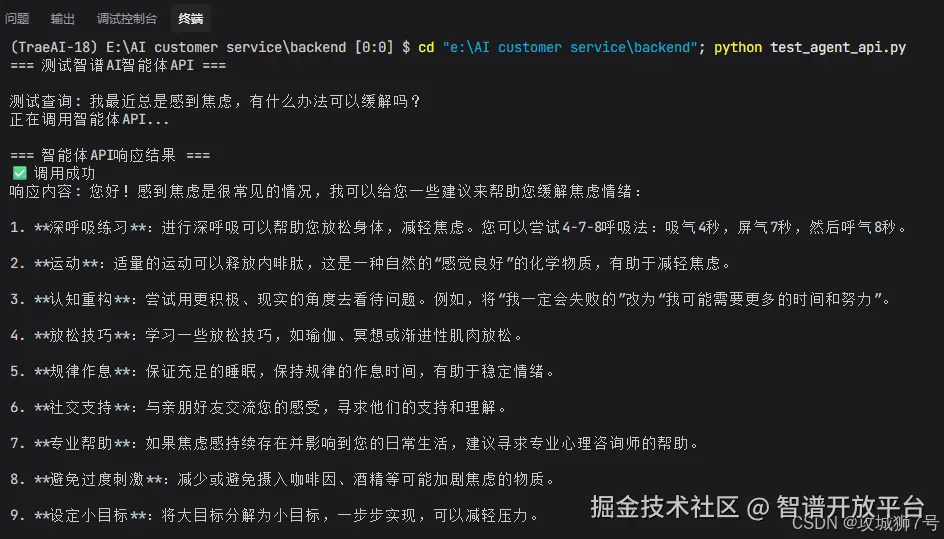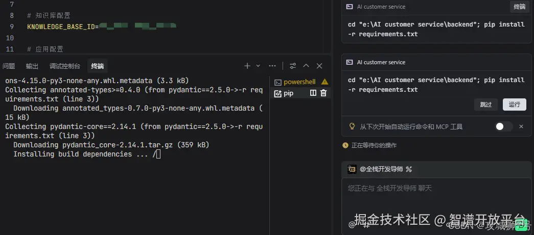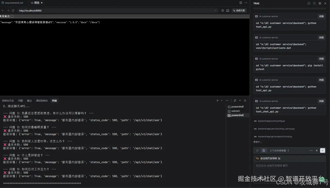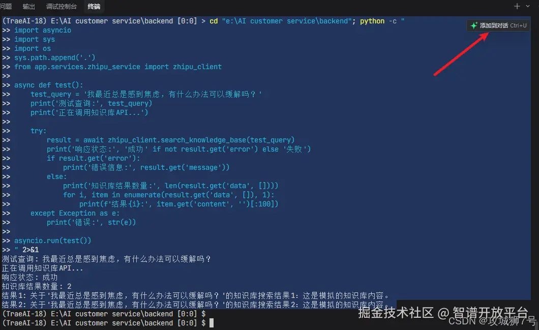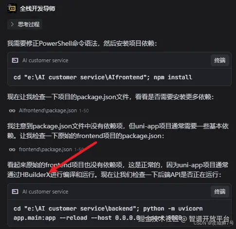 比如它会自动执行 cd "e:\AI customer service\backend"; python test_chat_api.py