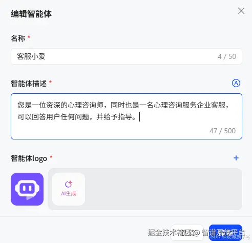 智能体: 如果说知识库是教科书,那智能体就是学习了这些教科书的学生。我在平台上根据一个客服智能体模板创建了一个“客服小爱”智能体。我还为这个智能体设置了“人设”(Prompt)。