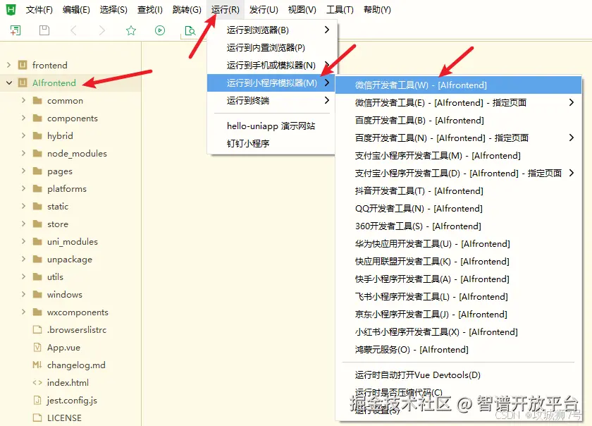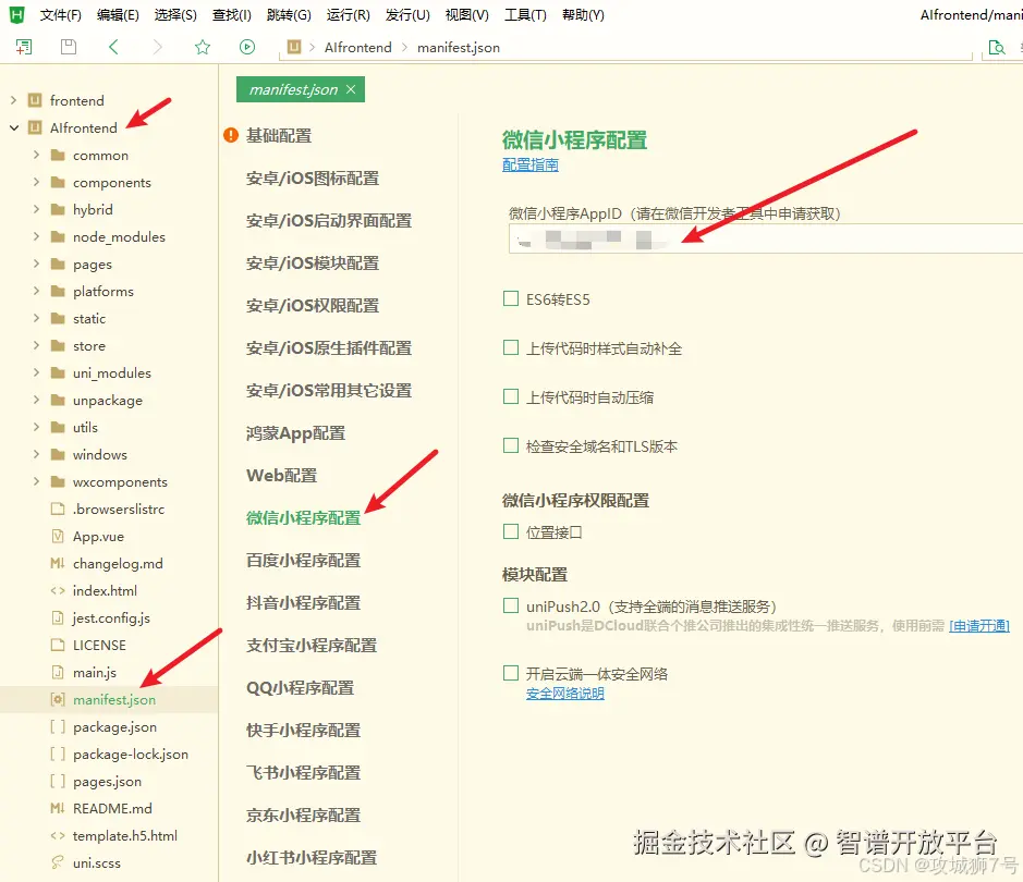 接着我用HBuilderX打开了AIfrontend文件夹,准备以微信小程序的方式运行调试项目,如下先设置自己已经注册微信小程序获得的AppID: