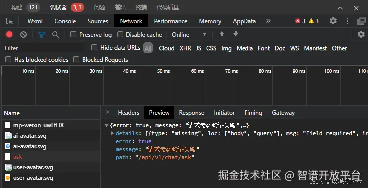 第一次不出所料的报错,然后我在HBuilderX的调试器中的Network中找到出错的接口: