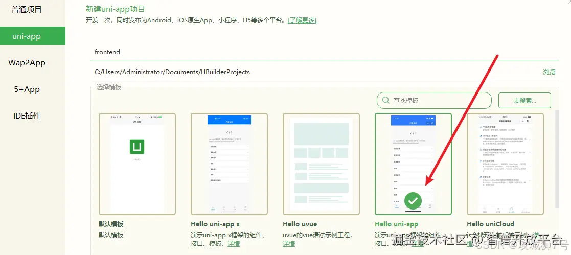 由此我便找到知名的HBuilderX软件自动生成的uni-app的项目模板,如下创建一个frontend名称的小程序项目模板: