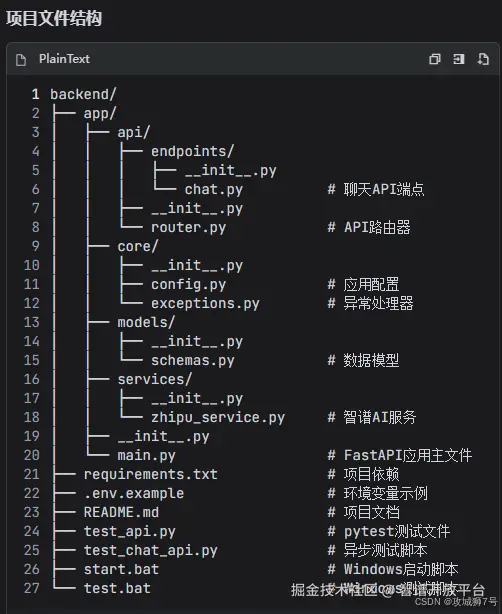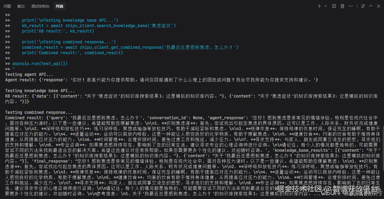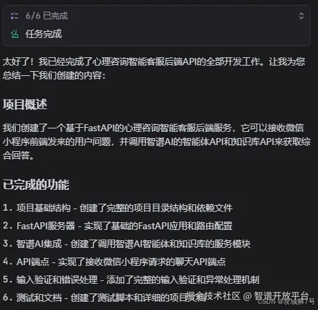 我:“Python3.9我已经安装,请帮我用FastAPI(我们已选定的后端框架)创建好项目框架,并创建一个用户和智能体提问的接口,至于如何实现,其中要调用智谱AI的智能体API和知识库api,api相关文档请参见上下文的设置,如果知识库中有答案就结合回答返回,也就是把提问的问题发送给智能体和知识库,看看他们是如何最终把回答返回给前端。请在代码中留出填写API Key和智能体ID,知识库id的位置。写好了请提供测试样例看看效果。”