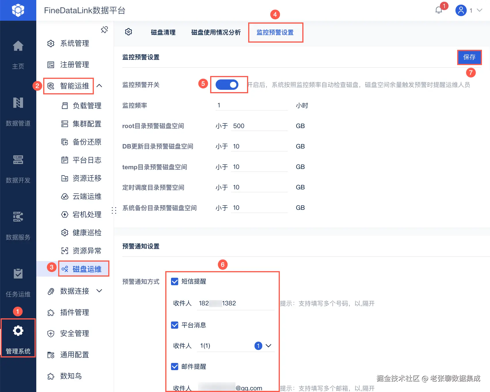 FineDataLink就具备这种健全的监控体系,你看,你直接在管理系统的磁盘运维上就能设置监控预警条件,一旦触发预警条件,系统就会立刻开启预警,并通过短信、平台或邮箱的形式发出警告。