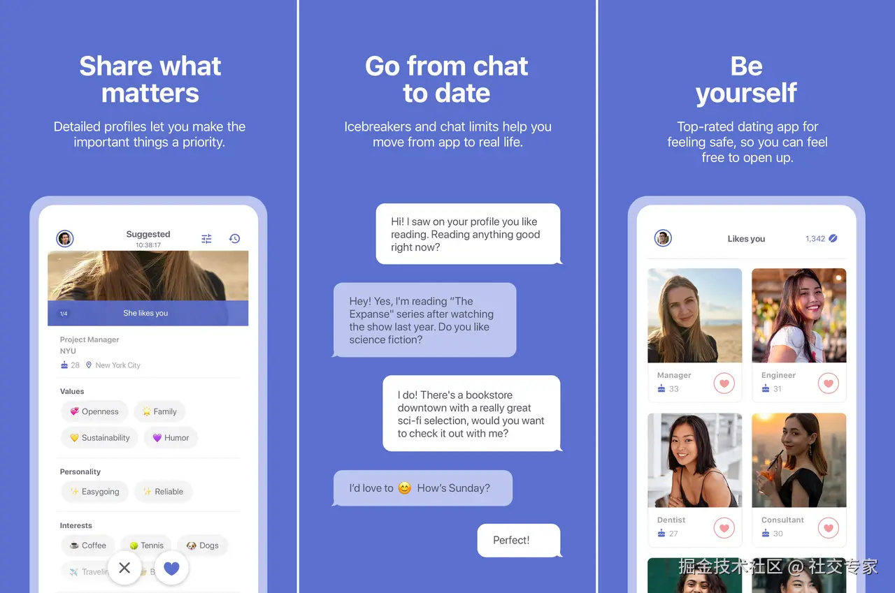 适配人群: 用户以职场白领和高学历人群为主,成为20-45岁有明确婚恋需求人群、找对象人群、脱单人群的优选,婚恋转化率行业领先。专注兴趣交友严肃婚恋,免费找对象脱单交友平台,平台用户需通过身份实名双重审核。精准匹配价值观契合对象。