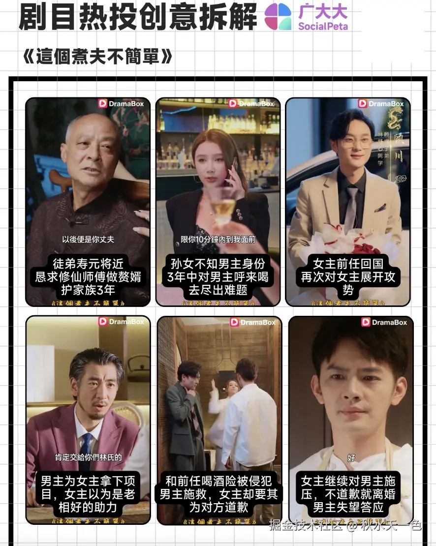 剧情开篇徒弟恳求师傅做赘婿,男主答应,但女主明显露出厌恶,埋下伏笔;中间剧情直接跳到3年后约定将到之时,用女主要求男主10分钟从20公里外的赶到身边的离谱要求,体现女主对男主的压迫以及男主自身能力的强大;当然也少不了短剧的必备角色——第三者男二的出现,用女主对两人的温差再次让观众对男主感到不值,救人后反被掌掴的剧情让这种憋屈感达到极致;结尾女主及父母再次对男主施压,要求其道歉的行为把剧情推向高潮,男主直接答应后,剧情停止在众人错愕表情上,让观众爽到一半的情绪瞬间遏制,提高转化。