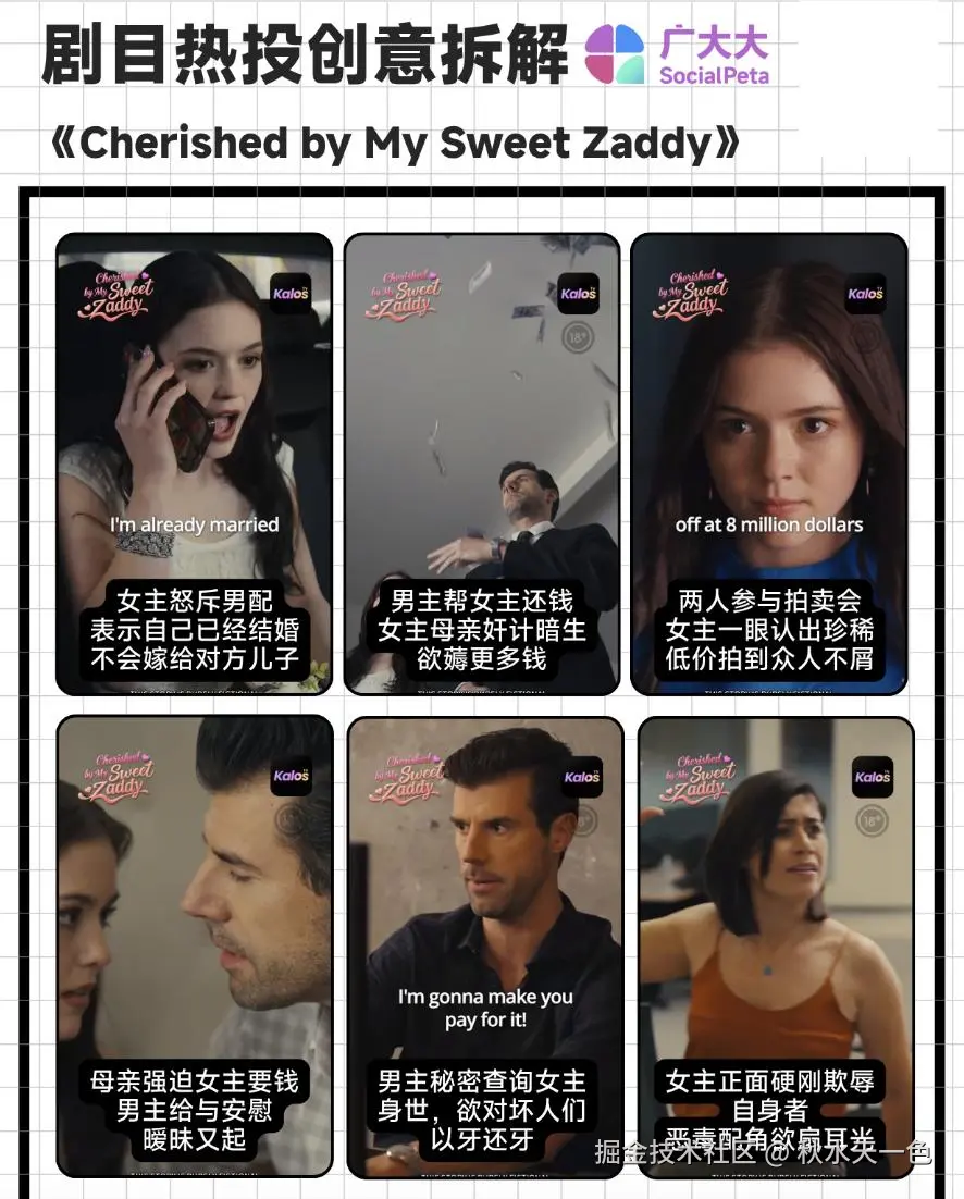 下面我们来浅拆下该剧的热门创意素材,上面这条素材时长约16min8s,投放时间7天,展示估值已经达到了28W。由于这个创意时长较长且内容丰富,我们仅对该素材中的高光剧情进行解析:剧情开篇用女主强势对抗恶人作为噱头,瞬间立起一个敢爱敢恨的正面形象,让观众生起好感;中间则是用男主帮忙还钱、帮找工作,以及女主慧眼识宝来加深两人的角色塑造;最后用小配角对女主的巴掌作为结尾,让所有人都对接下来的发展更加关注。