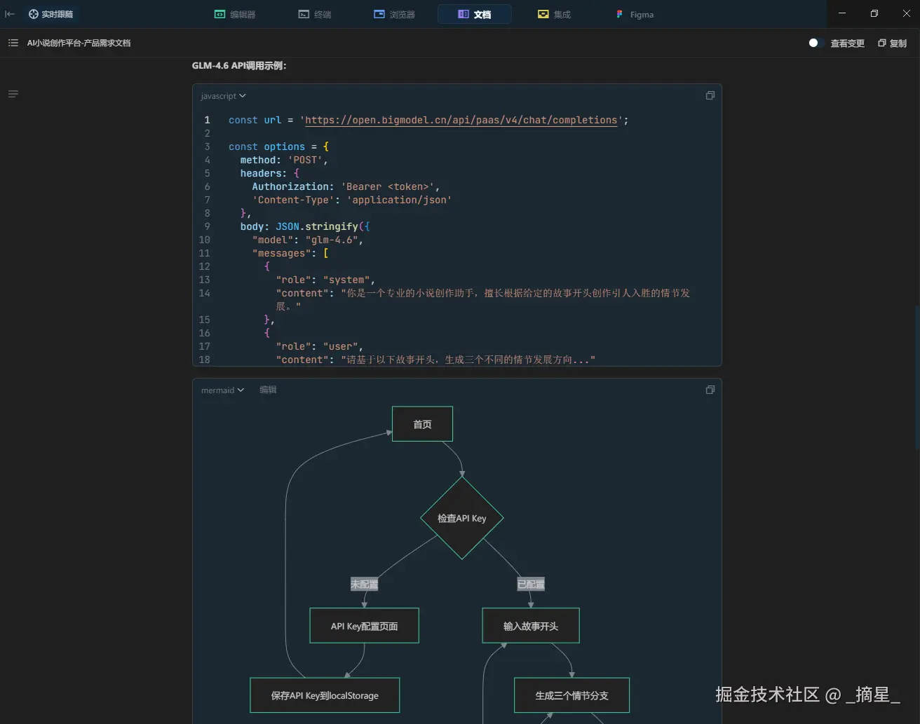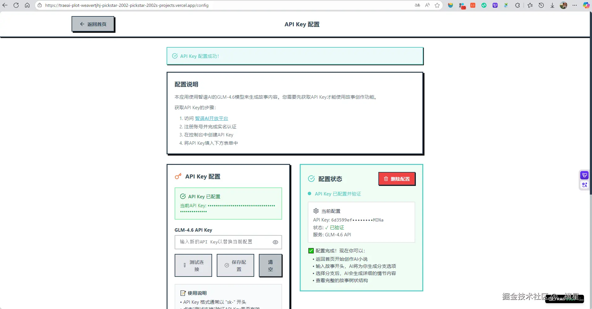 在“AI小说创作平台”这一应用中,我们正是依托 Trae Solo 的高效调度能力,结合 GLM-4.6 在叙事生成、情节延展与风格控制上的强大语言建模优势,实现了从用户输入的故事开头到多分支剧情概览、再到沉浸式章节内容的端到端智能创作。通过本地化 API 管理与无登录轻量架构,智谱大模型不仅为写作者提供了低门槛、高自由度的创作杠杆,更重新定义了 AI 驱动下互动式小说生成的新范式。