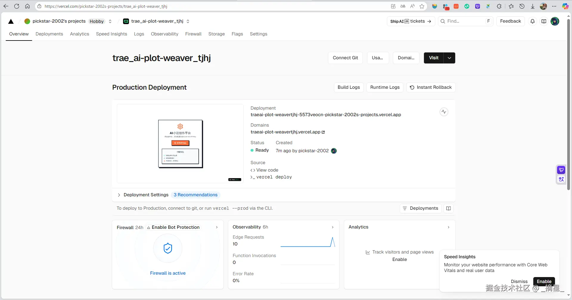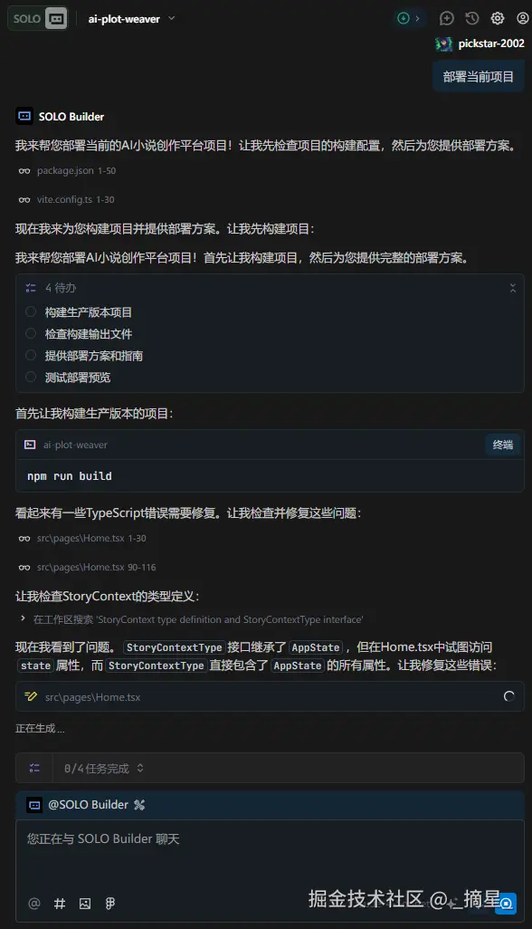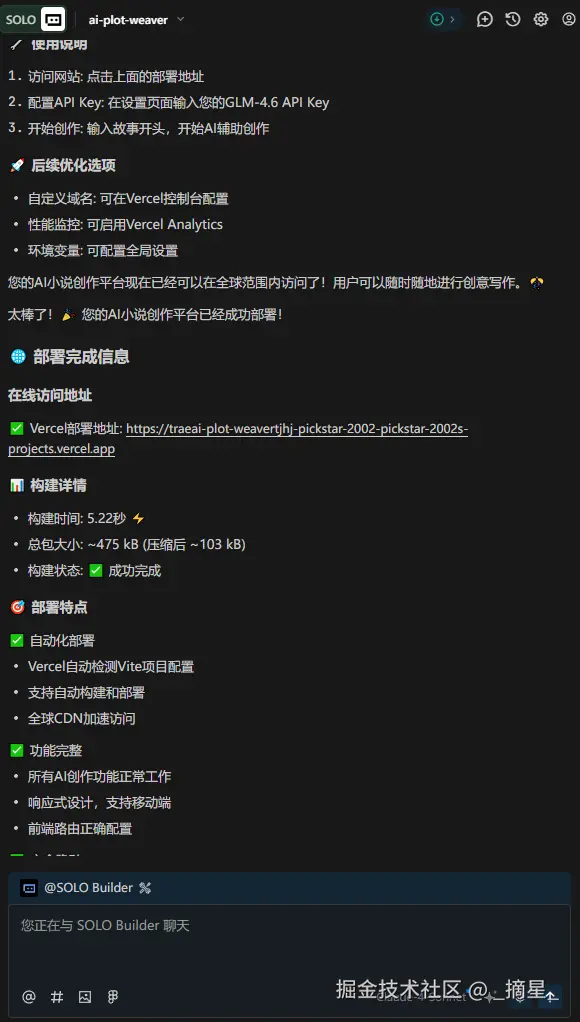 所有的功能都按照自己的想法开发完毕之后,就可以进入到部署阶段。在 Trae Solo 中,Vercel 被深度集成作为默认的前端部署与托管平台,极大简化了从开发到上线的全流程。开发者只需在 Trae Solo 项目中完成基础配置(如框架类型、构建命令等),即可通过内置的 “Deploy to Vercel” 一键发布功能,将 React、Next.js 等现代前端应用快速部署至全球 CDN 网络。Vercel 提供的自动 HTTPS、边缘函数支持、预览部署(Preview Deployments)以及环境变量管理,与 Trae Solo 的 AI 辅助开发理念高度契合——不仅加速了迭代速度,还确保了生产环境的稳定性与安全性。此外,Vercel 的无缝 Git 集成(支持 GitHub、GitLab 等)使得每次代码推送都能自动触发构建与部署,真正实现“写完即上线”。对于像 AI 小说创作平台这类轻量级、静态优先的应用,Vercel 的免费套餐已完全满足需求,是 Trae Solo 推荐的高效、可靠部署方案。Trae Solo