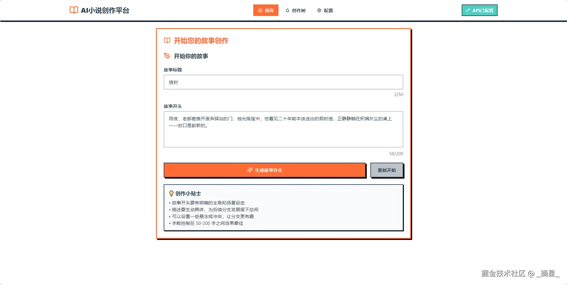 | 首页 | 故事输入区域 | 提供文本输入框,用户输入故事开头(50-200字),包含输入提示和字数统计 |