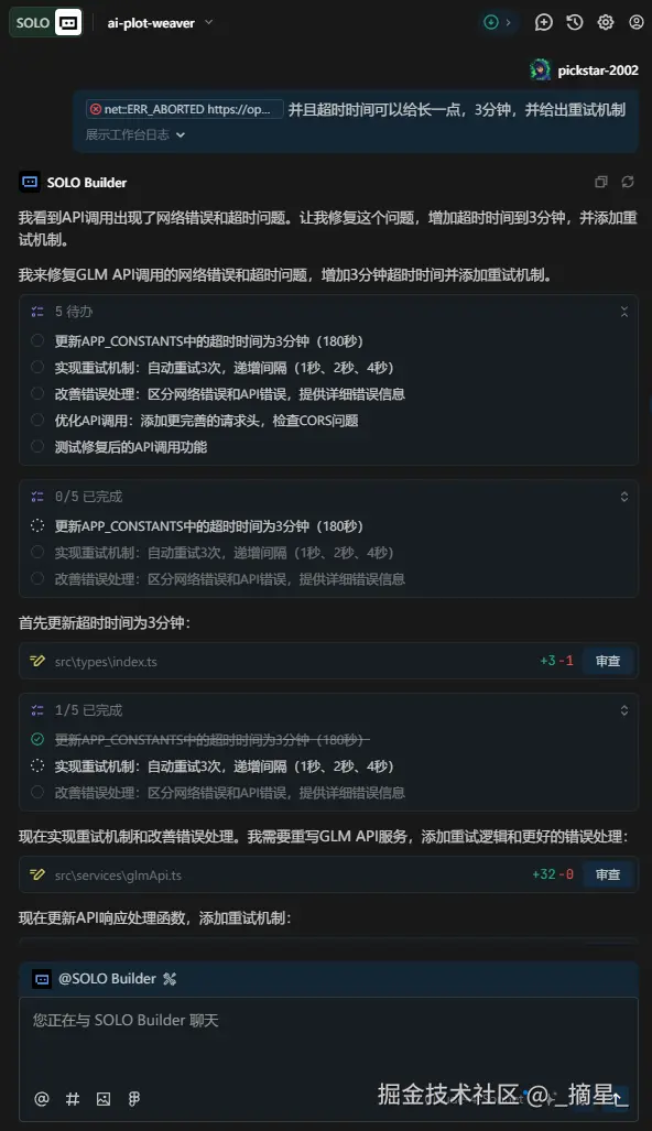 这时候我又发现,在AI调用的过程中的超时时间太短了,导致AI报错,那么我们就可以直接点击控制台中的日志报错,添加到对话中,并给出具体的需求,这样Solo就会帮我们针对性的解决报错问题。