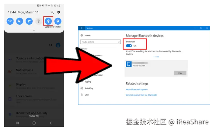 - 在电脑上设置为可被发现,并在手机上搜索并配对电脑。