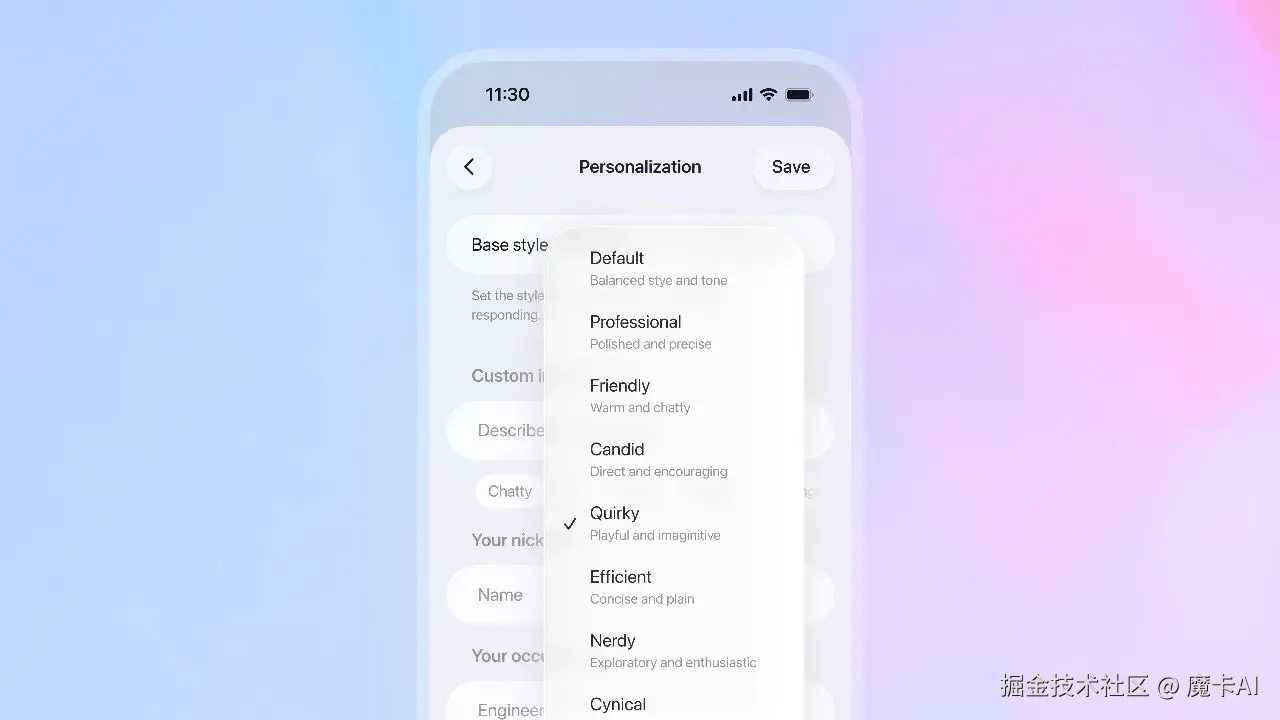 • 新增风格选项:专业(Professional)、坦诚(Candid)、趣味(Quirky)
