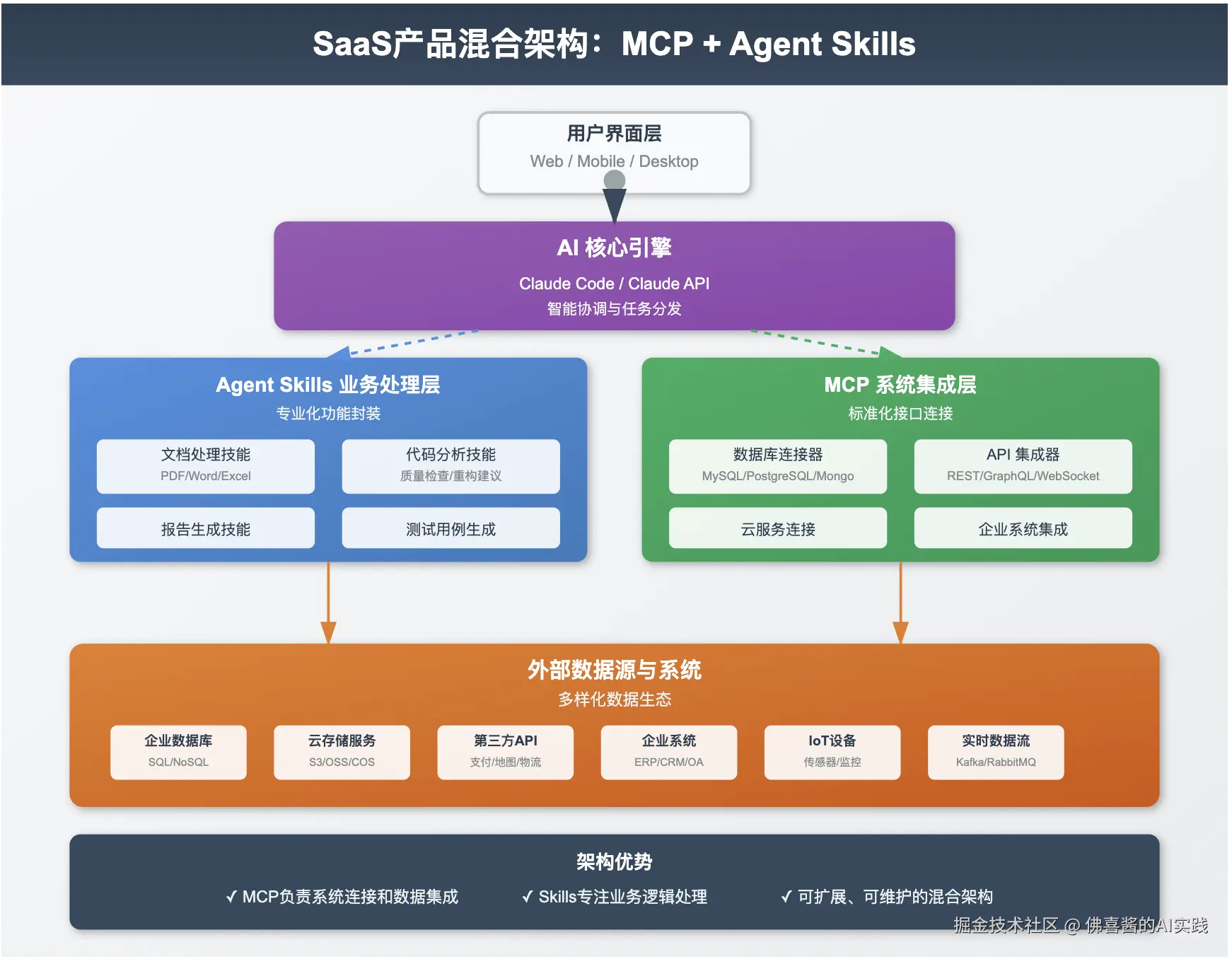 场景三:SaaS产品构建 如果你正在构建一个需要支持多种数据源的AI产品,用MCP作为架构基础,然后用Agent Skills处理特定业务逻辑。