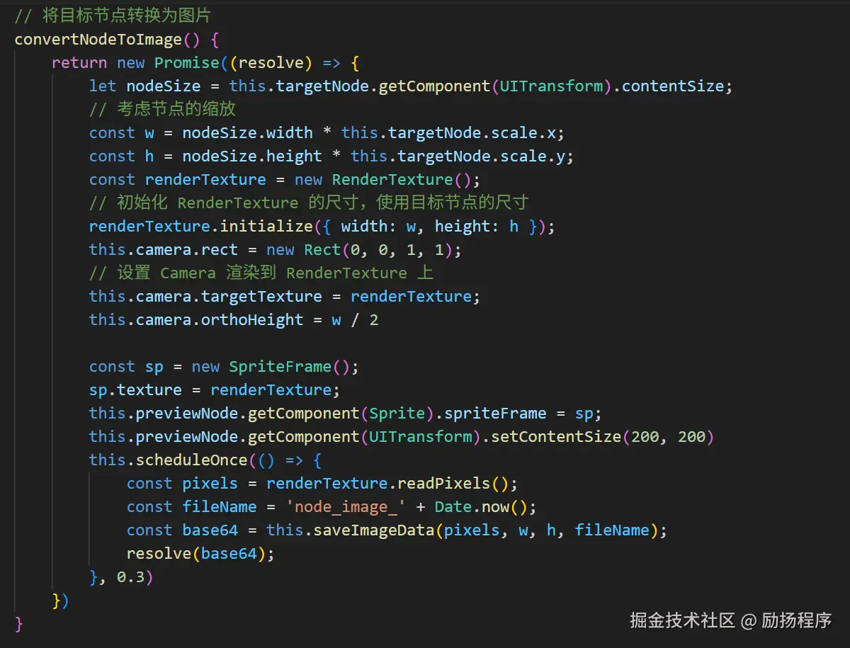在游戏开发中,截图功能是一项常见且实用的需求,它可以用于生成分享图片、保存游戏成就或创建预览图等。本教程将详细介绍如何在 Cocos Creator 3.8 中实现指定 Node 节点的截图功能,并将结果渲染到 Sprite 上。