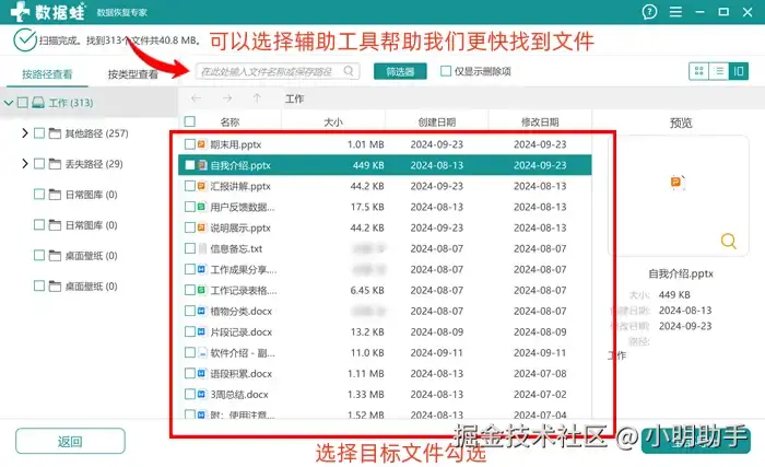 步骤2: 在软件扫描出来的文件中勾选出目标文件;如果扫描出来的文件数量过多也不用担心,在文件显示的区域上方,可以选择“筛选器”或“搜索框”,还有其他辅助工具进行使用;