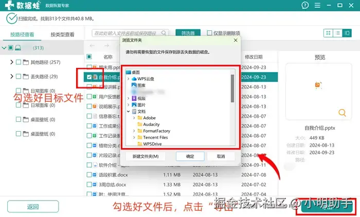 步骤3: 选择好文件后点击“导出”;最后还需要在“浏览文件夹“中选择文件恢复后存放的位置。
