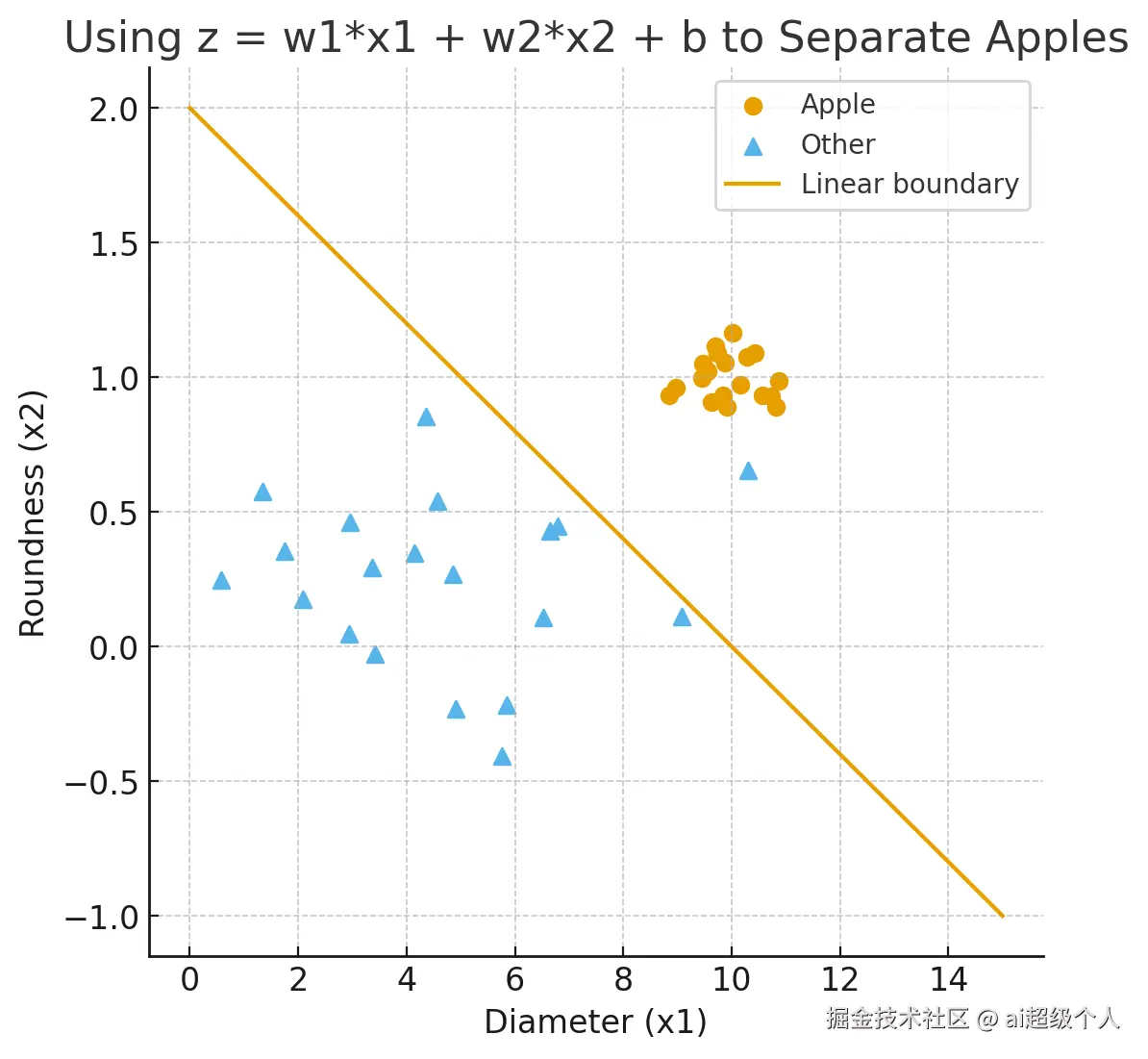 变为只有两个参数来决定是否是苹果,其实这是这是初中数学中的 线性方程,它的图像是一条直线。如下: