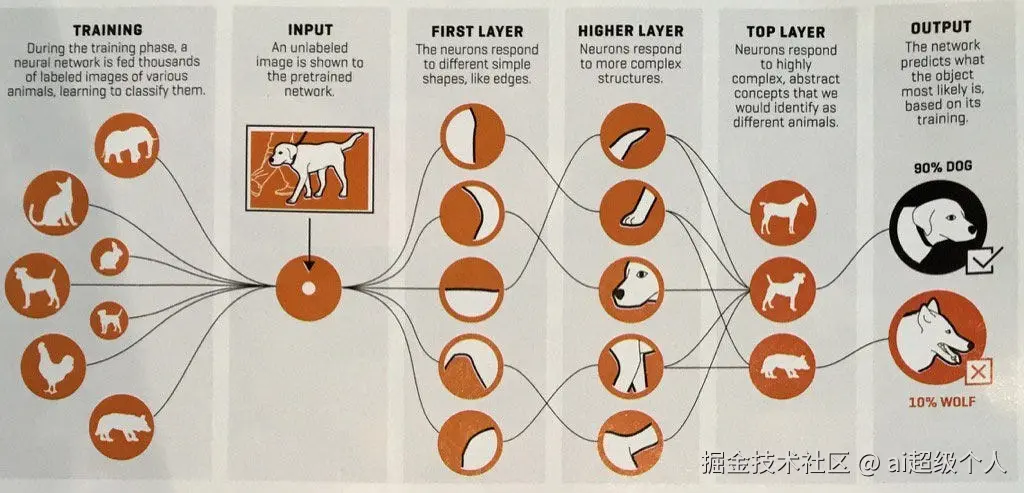 - 最后层(最终决策者):基于前面所有层传递过来的、已经高度抽象化的信息(比如“这是一个有胡须、尖耳朵、竖瞳的动物面部”),最终做出判断:“这是狗。”