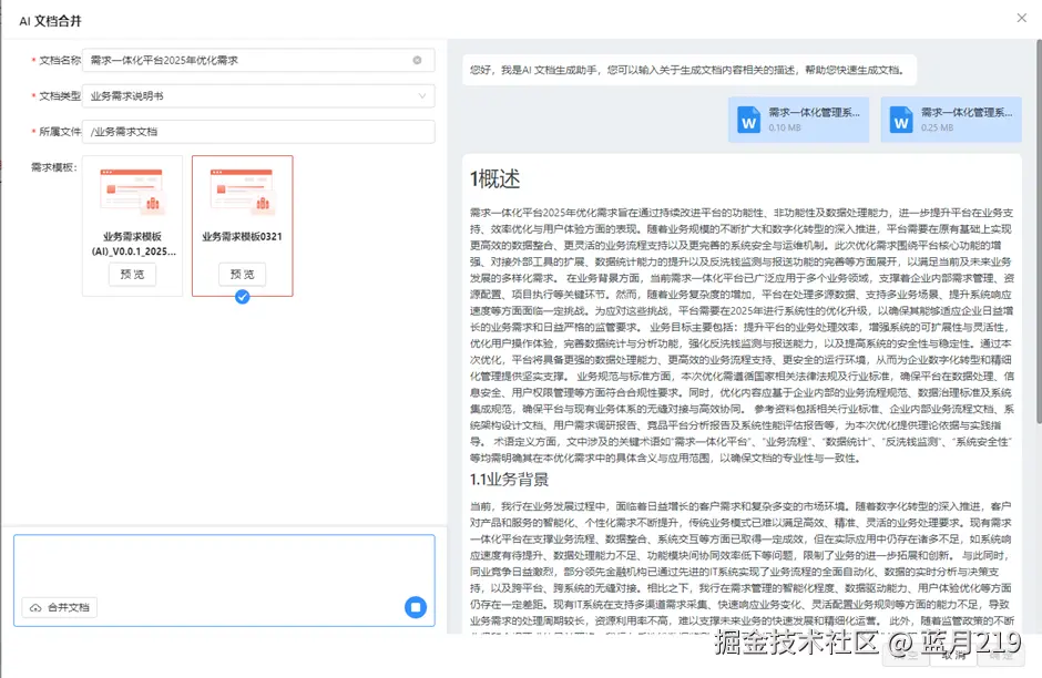 📌 用 AI 合并文档创建需求:当需求分散在多个碎片化文档中时,可通过 AI 合并功能将这些文档整合为统一的基线文档。AI 会智能识别文档间的逻辑关联,去除重复内容,确保合并后的文档结构清晰、内容连贯。